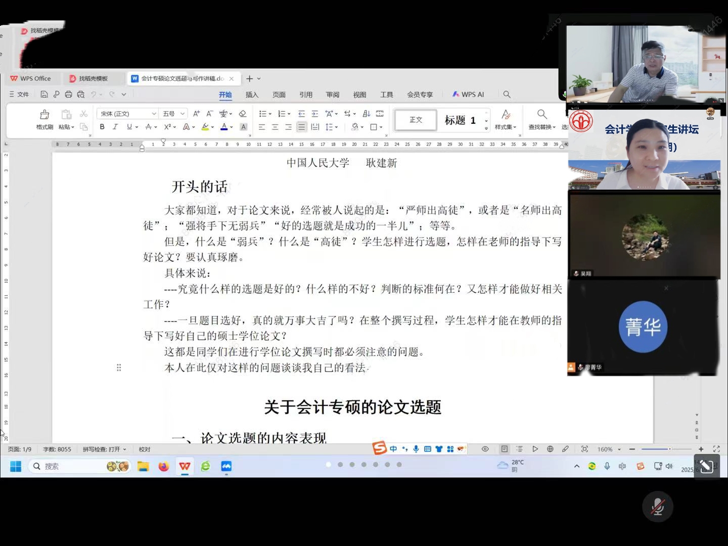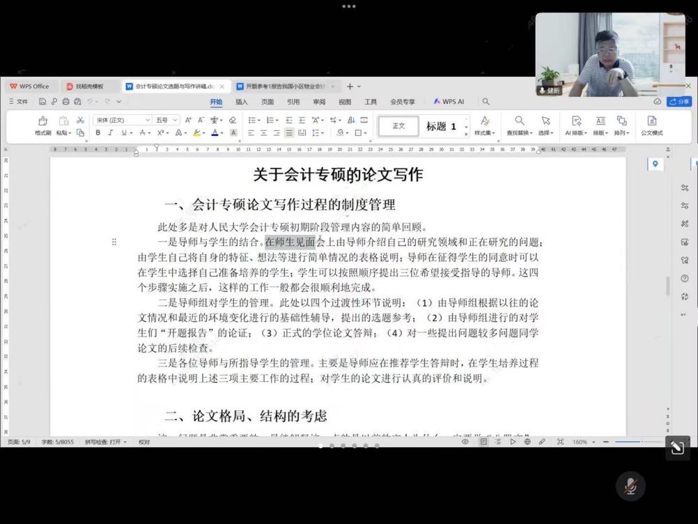 耿建新教授的讲座分为会计专硕论文选题与写作两个模块。在会计专硕论文选题模板,耿教授向大家介绍了会计专硕论文选题的内容表现细分方向会计专硕论文选题的一般出处、会计专硕可选论文类型及其与论文内容、方向的匹配等。耿教授强调论文选题需与实践相结合,从实践中根据个人兴趣选择论文选题及论文类型,如案例分析和专题研究等。在会计专硕论文写作模块,耿教授介绍了会计专硕论文写作过程的制度管理、论文格局与结构、对论文案例数据等资料的考虑、论文写作过程要注意的实际问题等,并分享了相关经验接着,耿教授以4篇代表性会计硕士论文为例,详细介绍了案例论文的选题角度开题报告的结构与内容论文结构与内容、论文写作语言表达以及格式的规范性等注意事项。