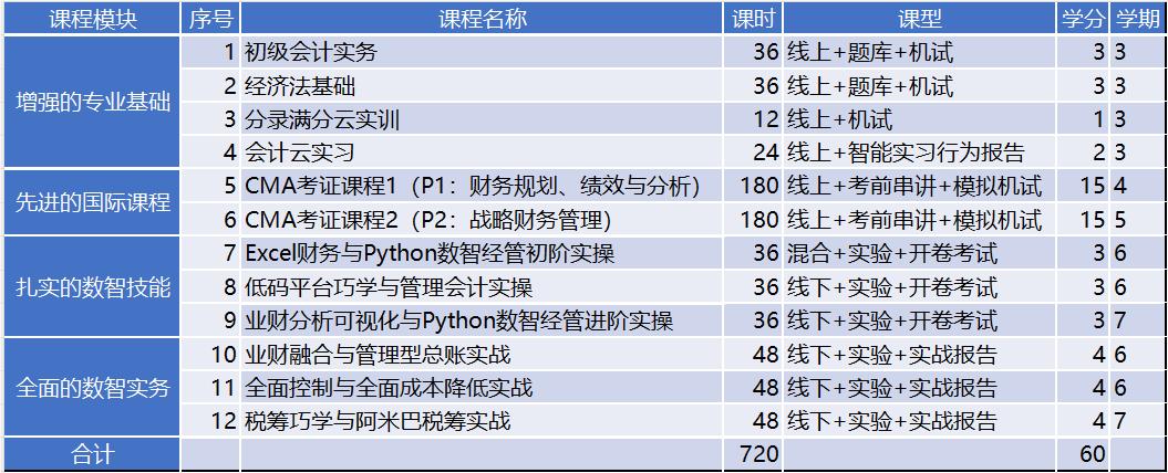 4、授课内容:主要包括“增强的专业基础”、“先进的国际课程”、“扎实的数智技能”和“全面的数智实务”四大部分。课程大纲如下表所示: