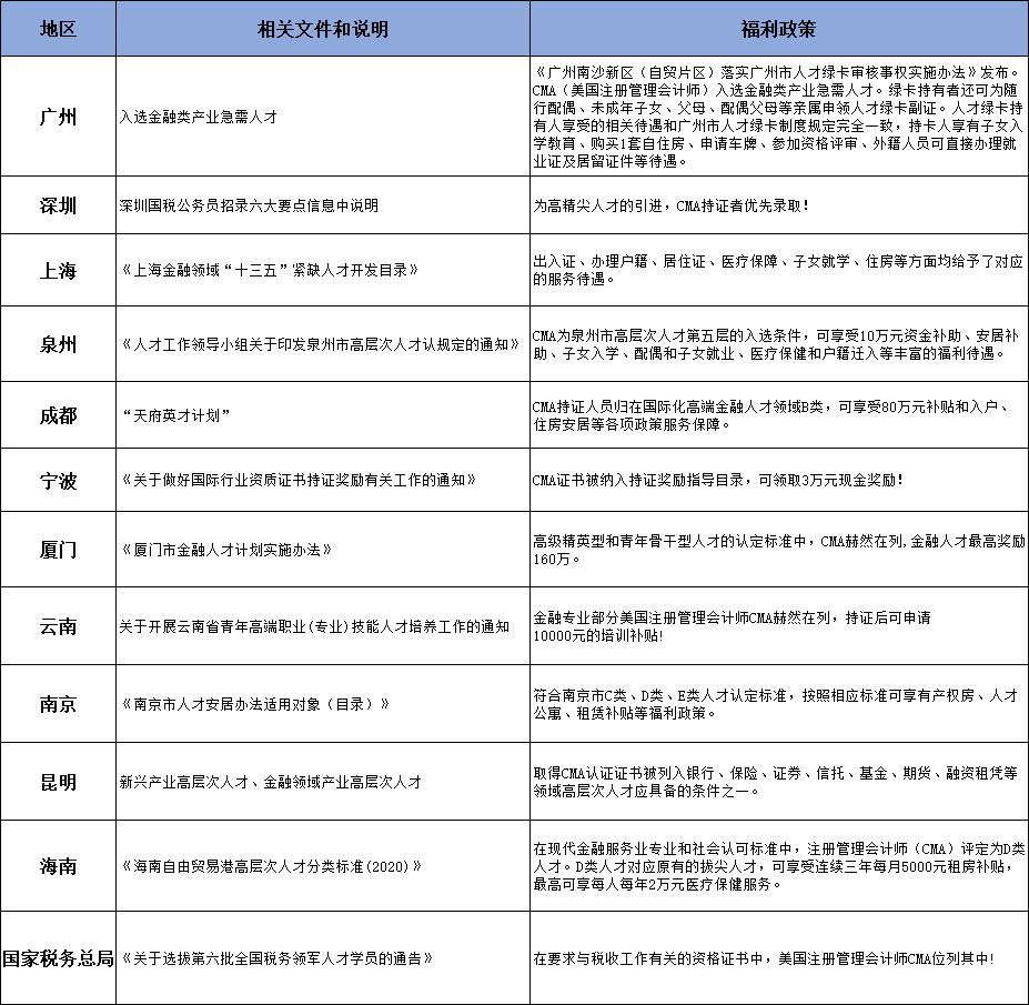 CMA被公认为国际财经领域的黄金标准,有国际财务界的“Mini-MBA”之称,是企业的“战略军师”。近些年,越来越多的企业在招聘财务人员时都明确显示CMA优先,比如阿里巴巴、华瑞怡宝、施耐德电气(中国)有限公司、星巴克等等。各大城市也纷纷把CMA纳入当地高层次人才库入选条件,现金奖励、住房补贴、子女入学、医疗保健等丰厚的福利待遇。