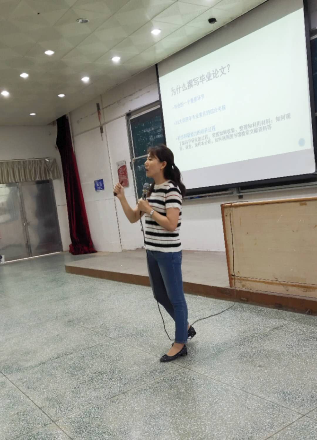 在王刚老师的主持下,动员大会正式开始。首先上台主讲的是陈茜老师,她为毕业生们讲述的主题正是大学四年里最重要的课题:本科毕业论文该如何写作?